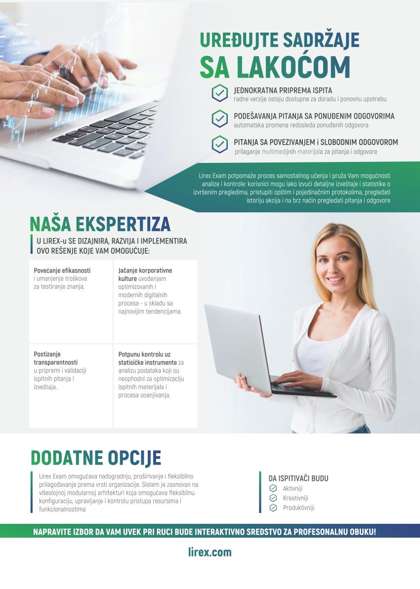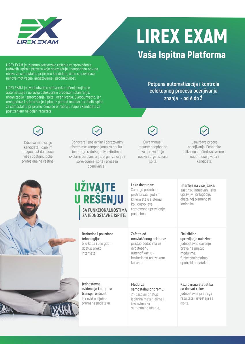 Pogledajte ponudu naših proizvoda: LIREX EXAM FOKUSIRAJTE SE NA VAŠE PRIORITETE A NAMA PREPUSTITE BRIGU O VAŠIM INFORMACIONIM TEHNOLOGIJAMA KONTAKTIRAJTE NAS